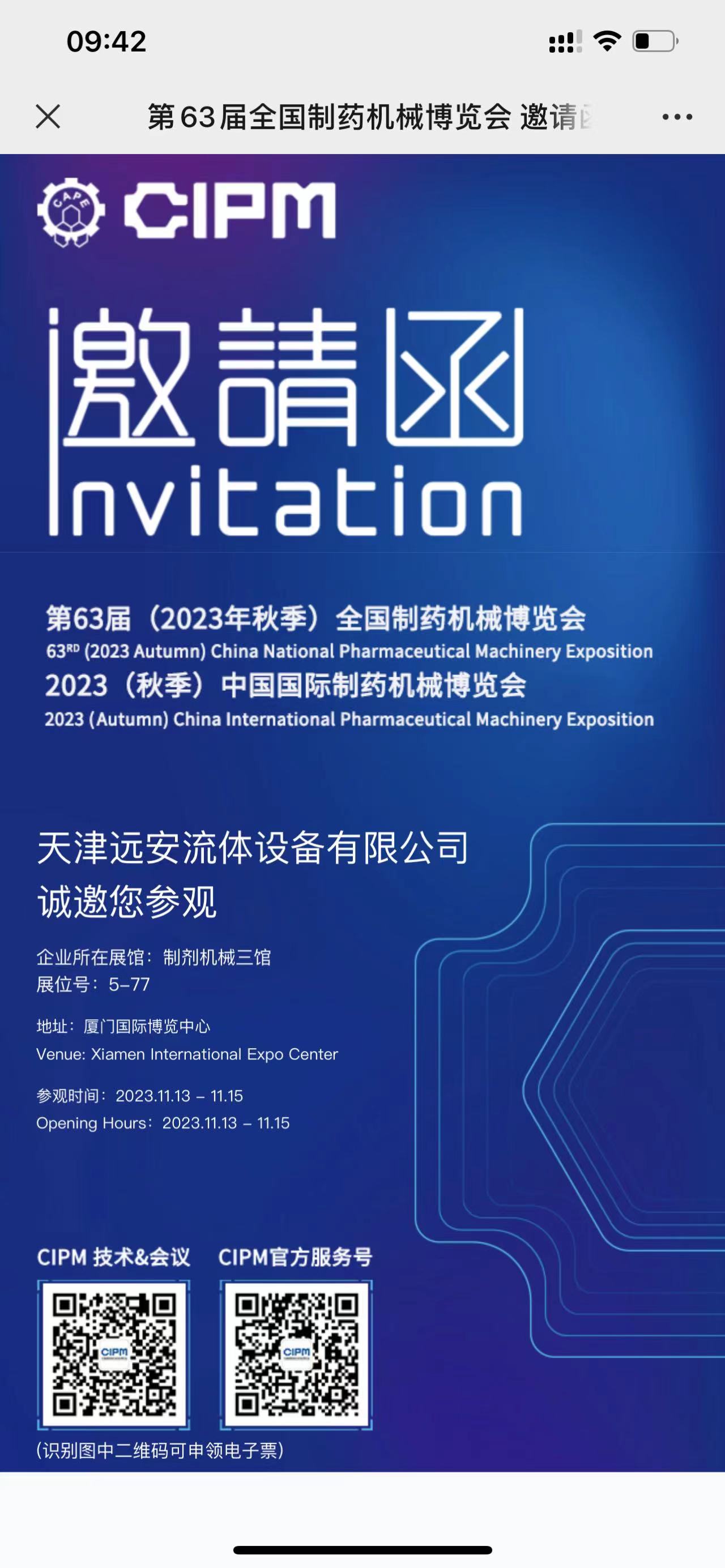 點(diǎn)擊邀請(qǐng)下載第6 3屆(2023年秋季)中國國際制藥機(jī)械博覽會(huì) CIPM廈門藥機(jī)展。天津遠(yuǎn)安流體設(shè)備有限公司誠邀您參觀。 地點(diǎn):廈門國際博覽中心 展位號(hào):5-77